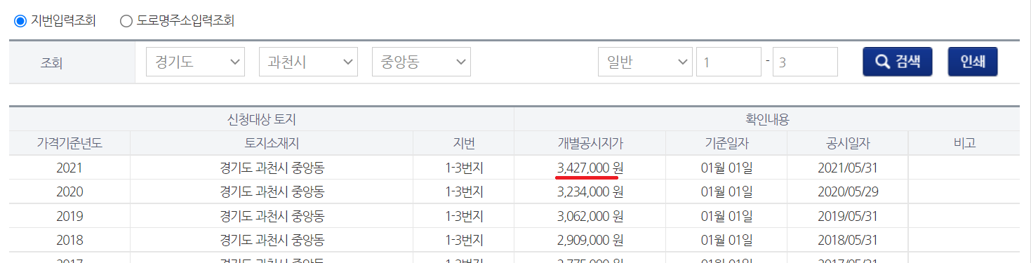 아래와 같이 과천시청의 개별공시지가를 확인하실수 있습니다.