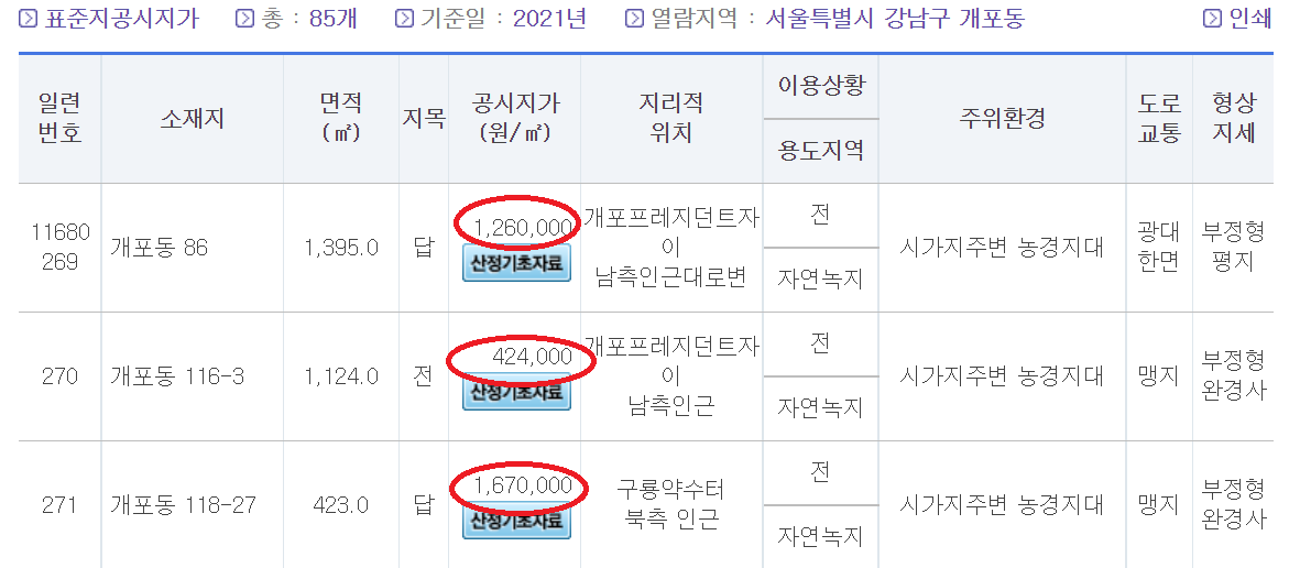 4) 아래와 같이 그 지역을 대표할수 있는 토지의 공시지가가 나오고 있는것을 확인할수 있습니다.
