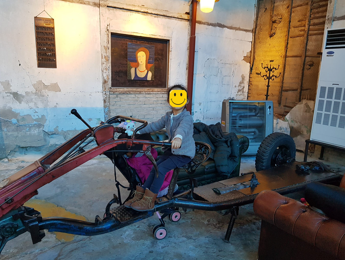 자리잡은 소파앞에 경운기 모습을 한 옛 물건이 잘 어울어져 있습니다.