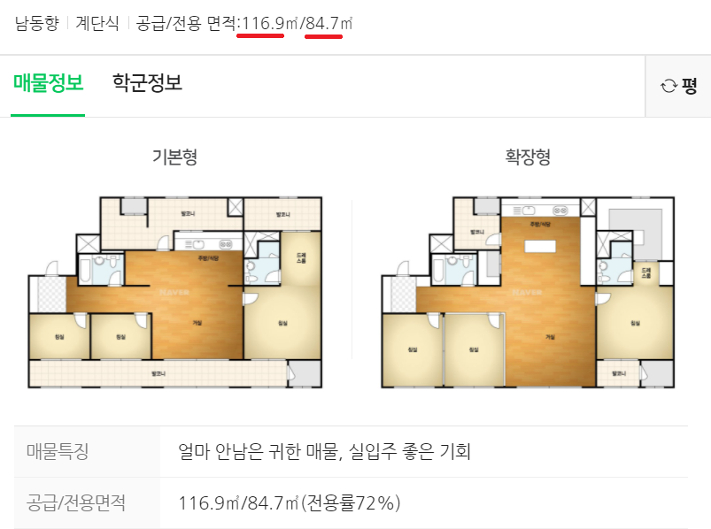 1) 공급면적 : 전용면적 + 주거공용면적
