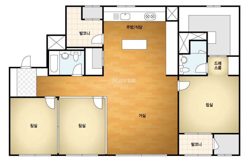 그런데 서비스면적 중 하나인 발코니를 확장하여 거실, 침실, 창고 등의 실내공간으로