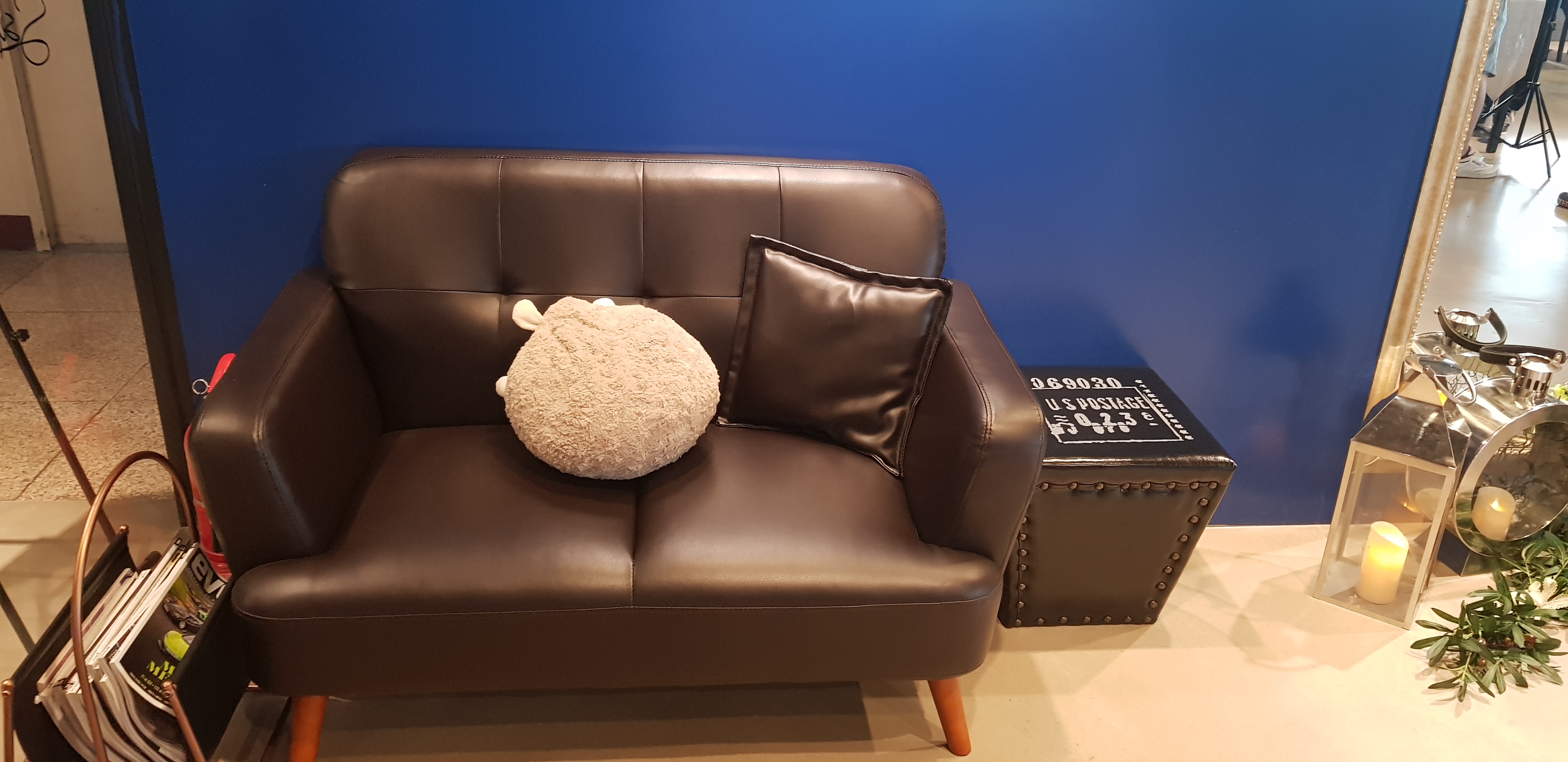 입구에 예쁜 소파가 있습니다.
