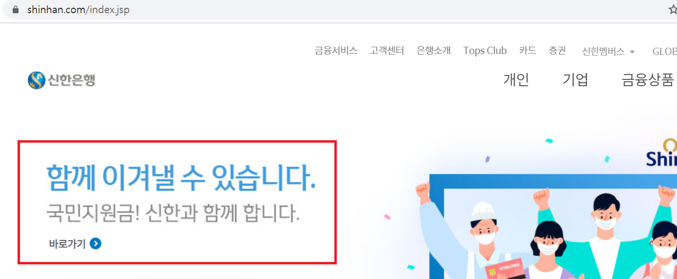 1) 신한은행 홈페이지에 들어가면 아래와 같이 국민지원금 바로가기가 있습니다.