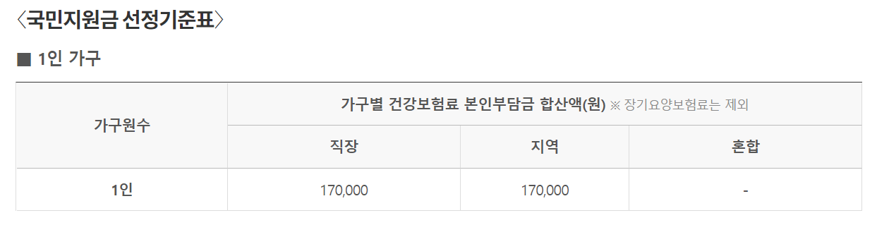 170,000원 이하의 건강보험료를 납부한 사람만이 자격을 획득하는 것을 확인하실수 있습니다.