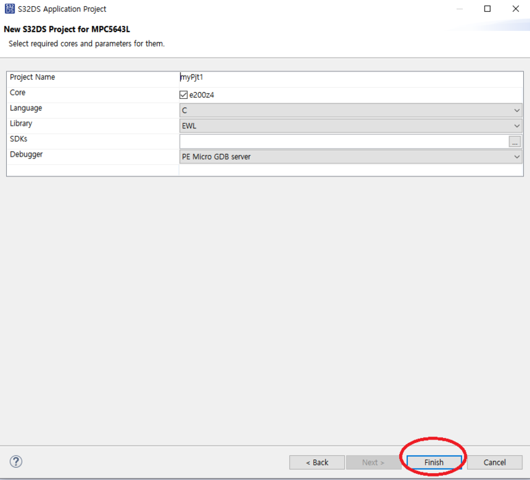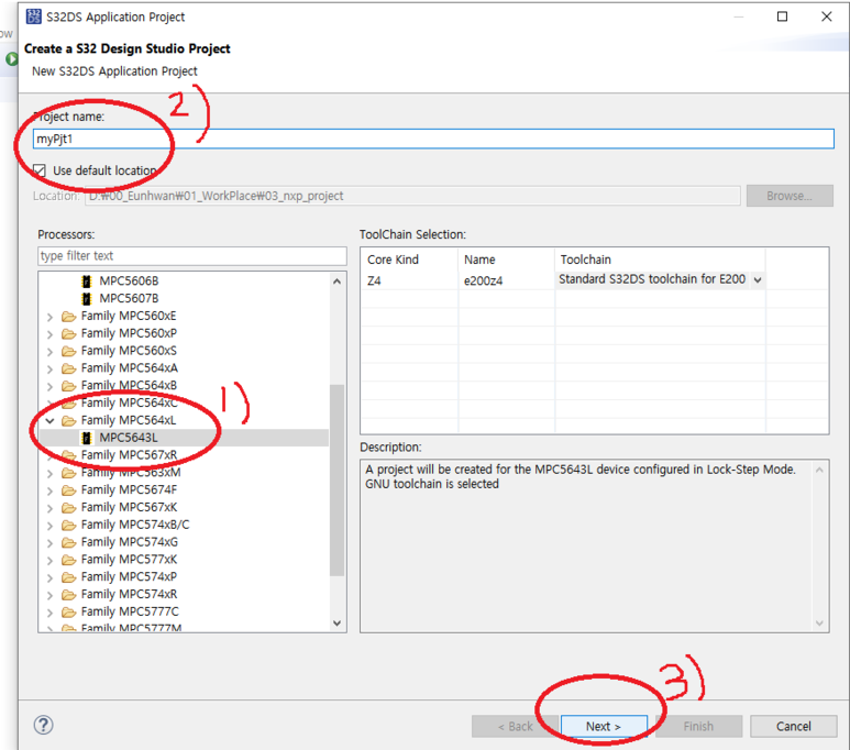 3. 아래와 같이 MPC5643L을 누루고 Project 이름을 기입하고 Next를 누룹니다.
