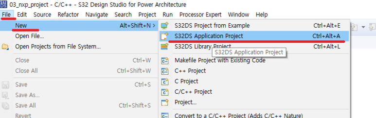 2. S32 Design Studio를 열고, 아래와 같이 File-> New->S32DS Application Project 를 누룹니다.