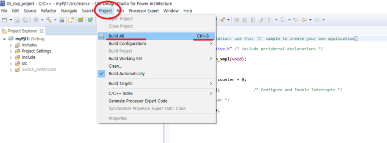 5. 프로젝트가 생성되었습니다. 그러면 아래와 같이 Project에서 Build All을 누루세요. 컴파일을 시켜 봄니다.