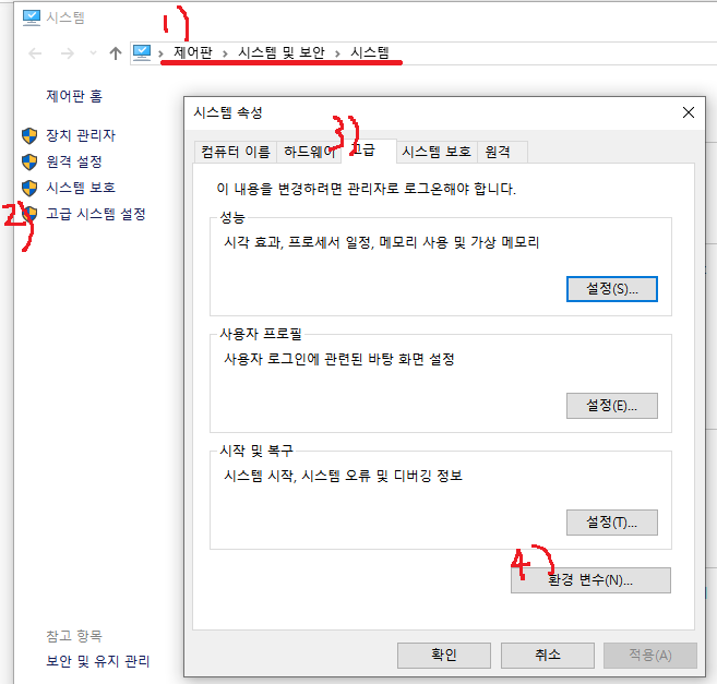 13. 설치를 했으면 1)번을 따라가서 2~4)번을 눌러주세요. 환경변수 설정을 해야합니다.