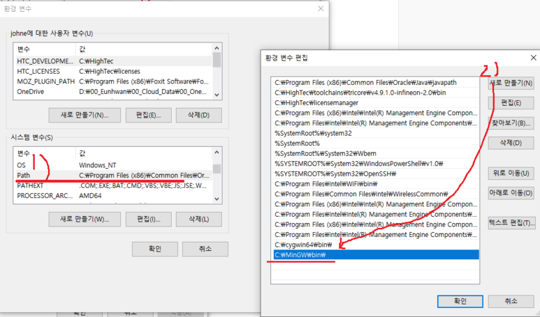 MinGW를 설치한 path를 설정해 주셔야 합니다. 그리고 컴퓨터를 한번 재부팅 시켜 주세요.