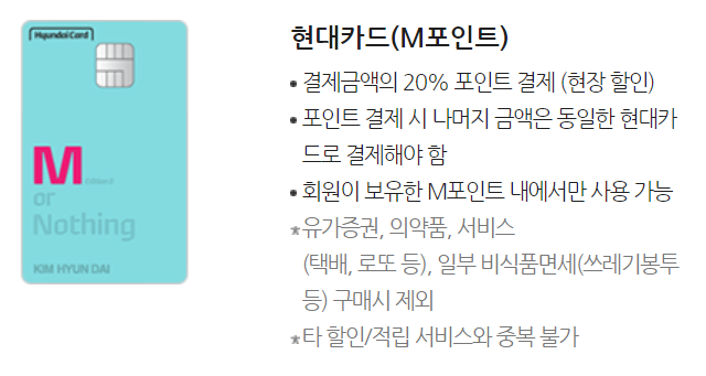 아래와 같이 현대카드 사용시 M포인트 20%차감할인 가능합니다.