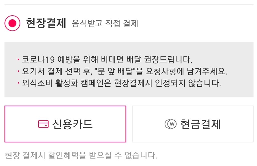 하지만 현장 결제를 할 경우 요기요나 배달의민족에