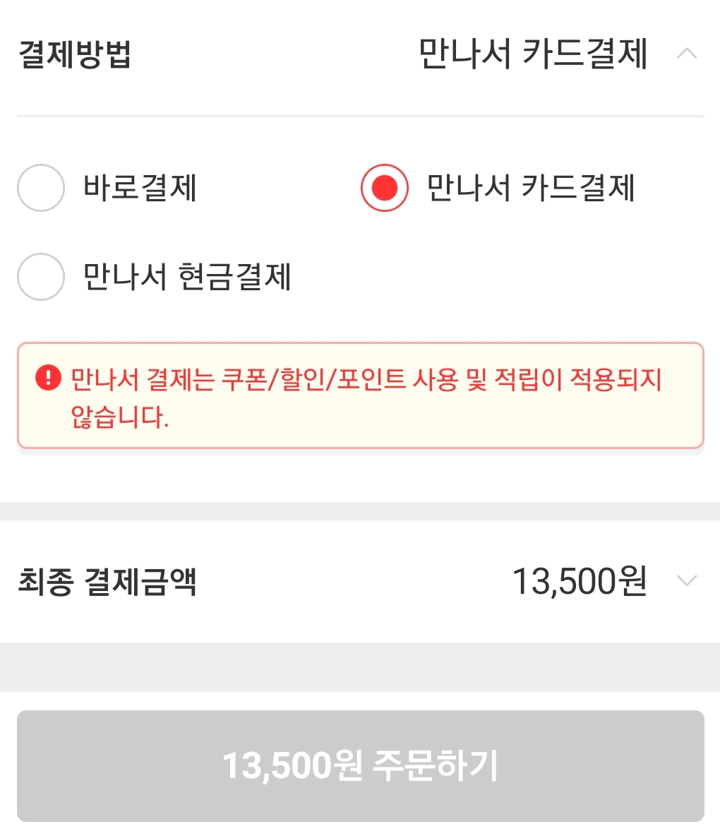 3. 아래와 같이 만나서 카드결제 및 만나서 현금결제를 선택합니다.
