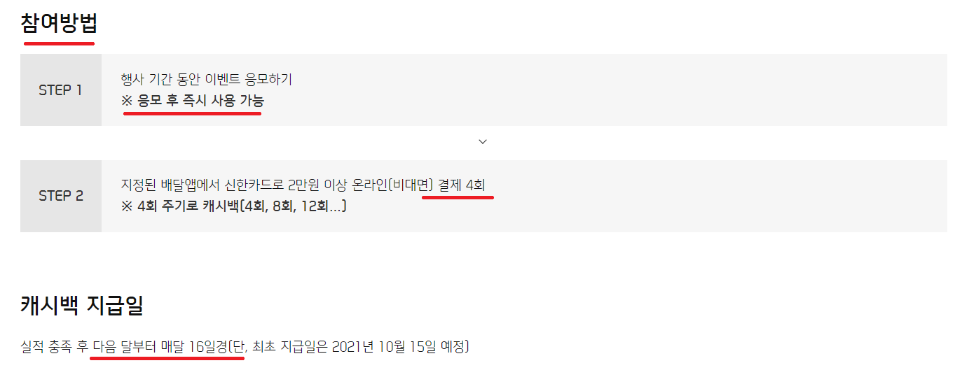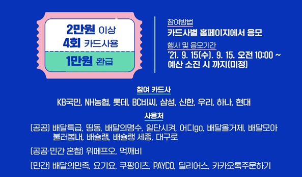 - 지정된 배달 앱에서 온라인(비대면)으로 2만원 이상 4회 사용할 때마다 1만원 캐시백!