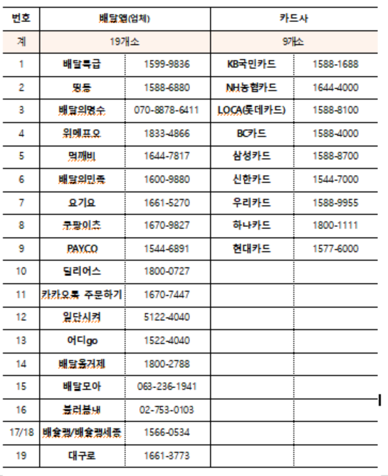 마지막으로 카드사, 배달앱 문의처를 캡처하여 올립니다.