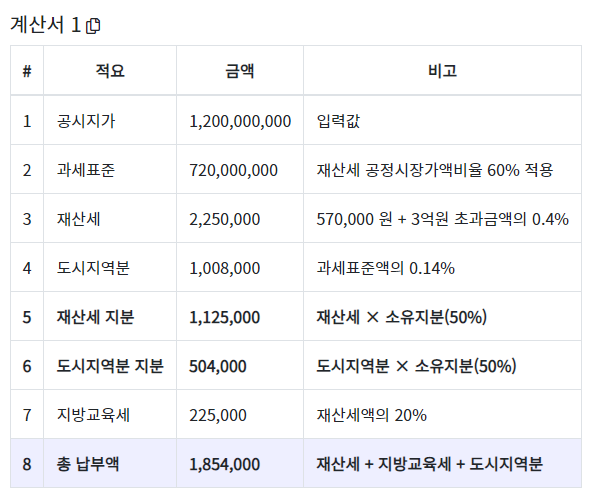 재산세 중복분 = (930,000 × (50,000,000 × 0.95 × 0.6 × 0.004)) / (570,000 + (390,000,000 - 300,000,000) × 0.004)