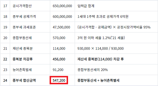 따라서 최종 종합부동산세 = 456,000 + 91,200 = 547,200원 입니다.