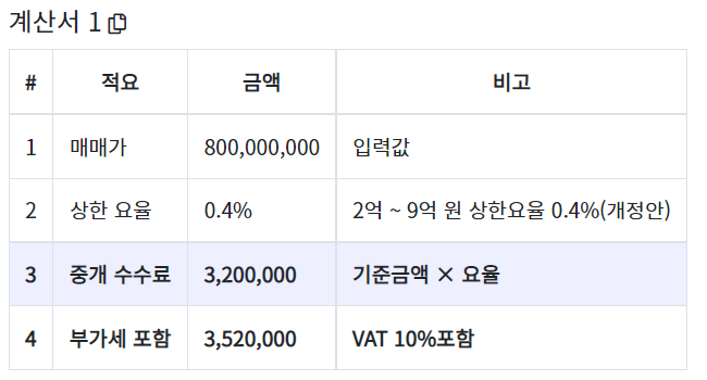 - 중개수수료 = 800,000,000 x 0.004 = 3,200,000