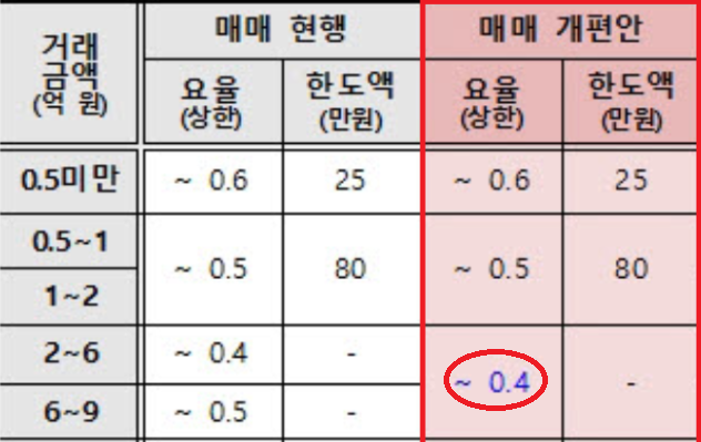 - 아래와 같이 매매 개편안 상한 요율은 0.4%입니다.