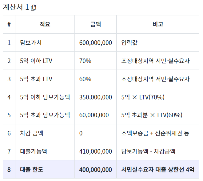 결국, 최대로 많이 받을 수 있는 주택담보대출은 4억이라는 것을 확인할 수 있습니다.