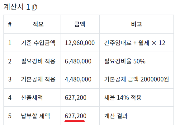 즉, 1년동안 전세금으로 얻은 소득을 12,960,000원으로 간주하겠다는 것입니다.