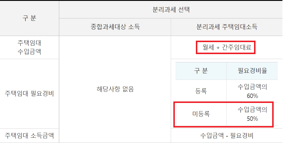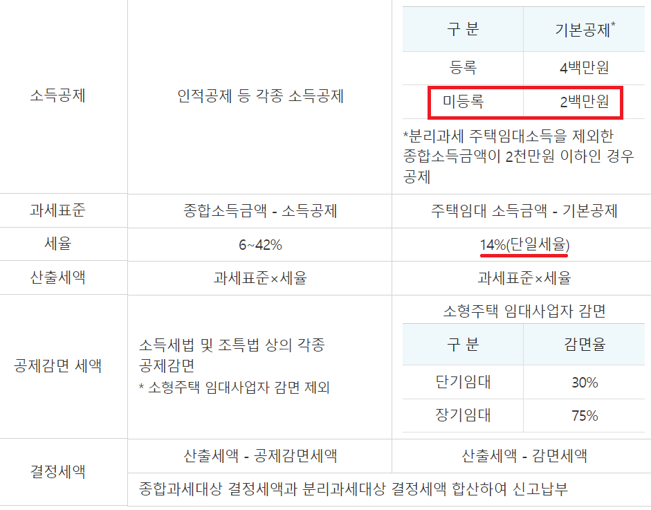 분리과세를 계산하는 과정에서 임대주택으로 등록한 경우와 미등록한경우의 차이는 아래와 같습니다.