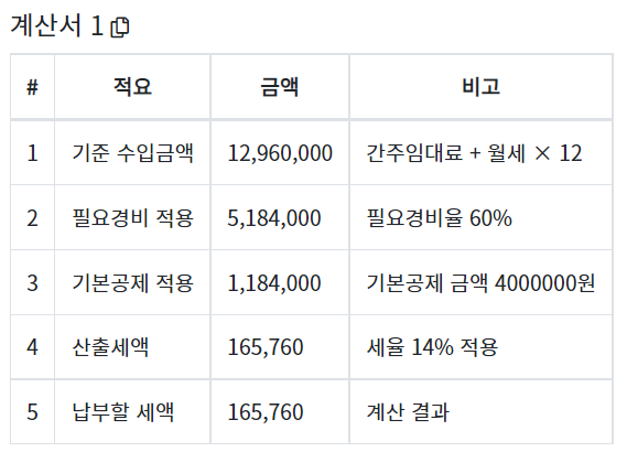 분리과세, 종합과세를 계산하는 과정에서 월세 + 간주임대료를 함께 합산하여 세금을 계산해야 합니다.