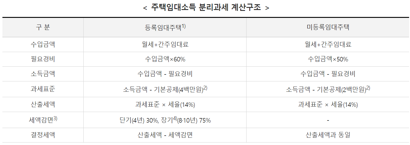 1) 분리과세란 주택임대소득만 분리하여(세율 14%)로 세금을 계산하는 방법입니다.
