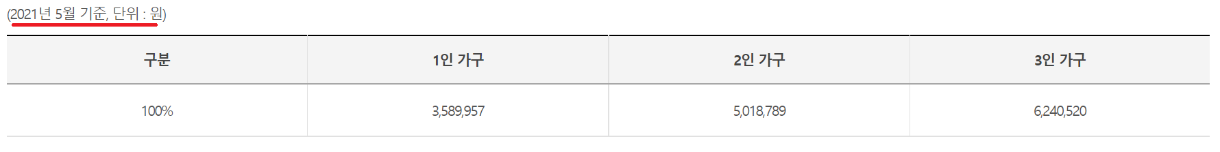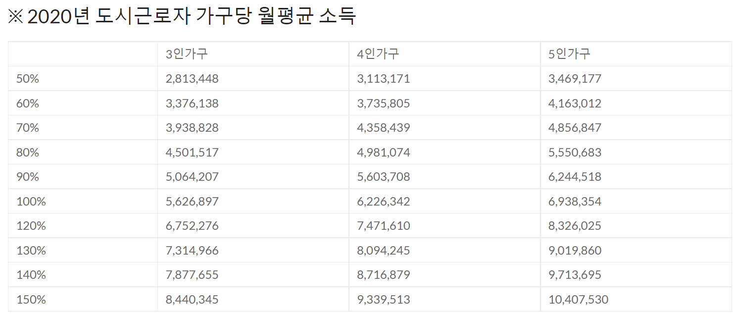 위에서 월평균소득 100%이하라고 이야기하는 부분은 도시근로자 가구당 소득 100%이하를 의미합니다.