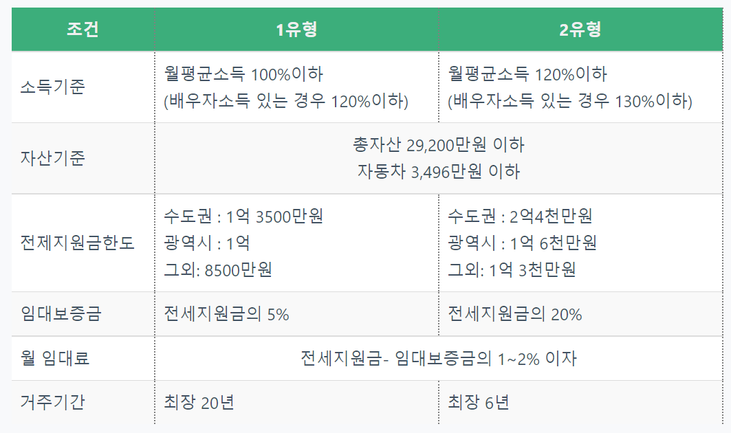 1 유형, 2유형에 따라서 보증금 지원한도도 다르고