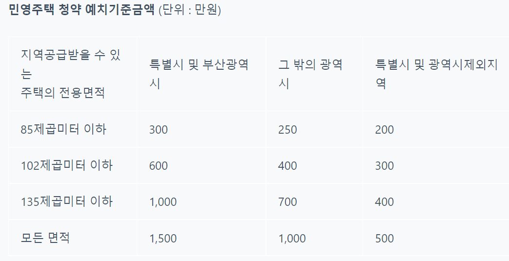 청약지역과 면적에 따라서 아래의 예치 기준금액을 초과한 금액이 청약통장에 예치되어 있어야 함.