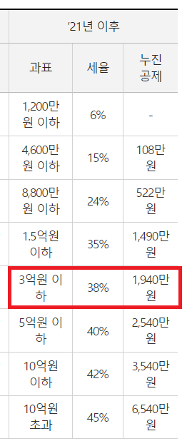 3억 이하 양도소득 => 38% (누진공제: 1,940만원)