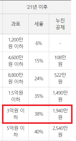- 양도소득세율 = 38%(3억원 이하), 누진공제 1,940만원