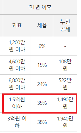 - 양도소득세율 = 35%(1.5억원 이하), 누진공제 1,490만원