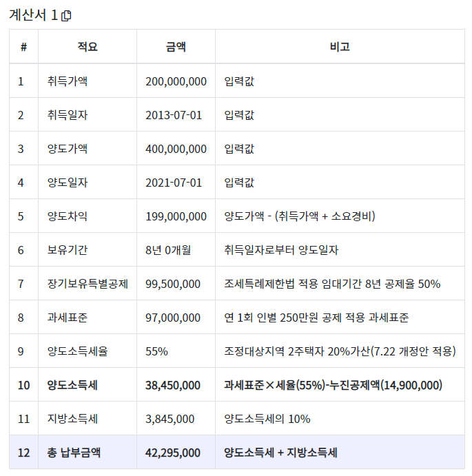 장기보유특별공제 8년 임대 적용시 양도소득세는? (2021년 7월에 양도함)