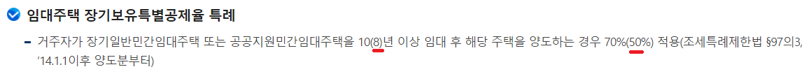 - 장기보유특별공제 : 조세특례제한법 적용 임대기간 8년시 공제율은 50%