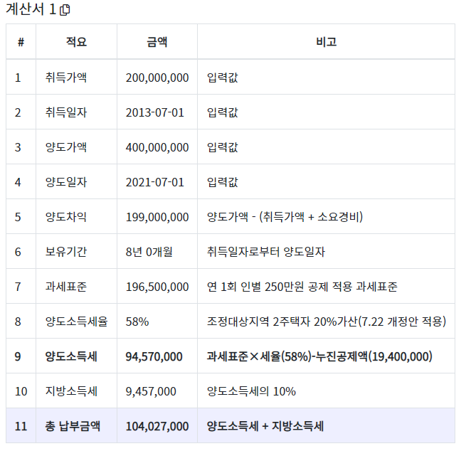 1) 2주택자, 취득가액 2억, 양도가액 4억, 조정지역, 보유기가 8년, 중계수수료 100만원