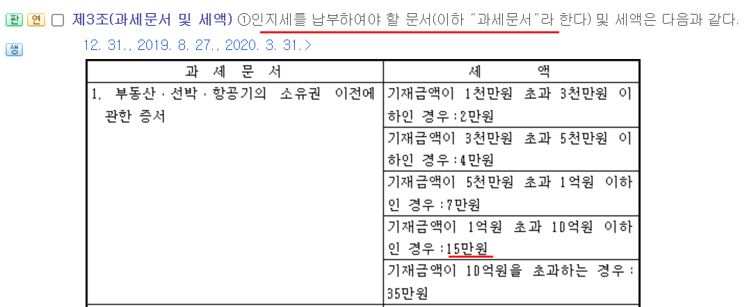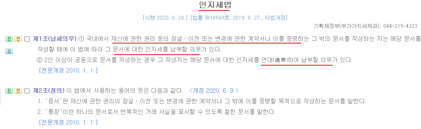 아래는 국가법령정보센터에서 확인할수 있는 인지세법을 캡처한 것입니다.