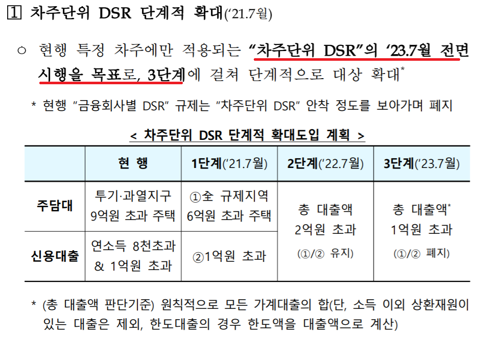 아래와 같이 3단계 시행을 통하여 DSR 규제를 강화할 것입니다.