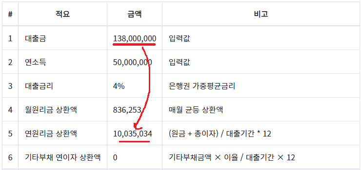 DSR = (주택대출 원리금 상환액 + 기타 대출 원리금 상환액) / 연간 소득