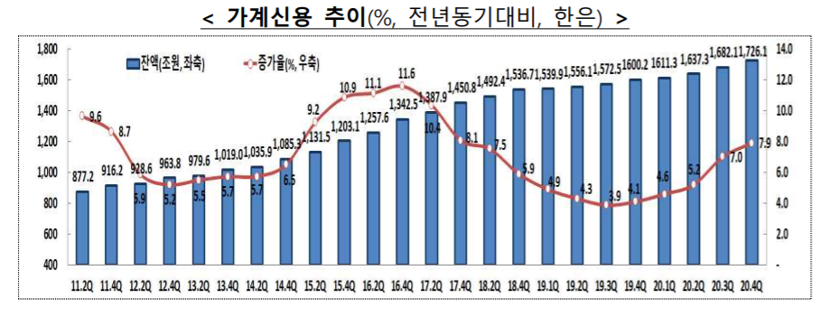 가계부채는 2020년 말때 1726조인것을 확인할수 있습니다.