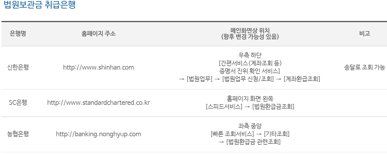 법원보관금조회 안내 안내문 법원송달료의 출금(환급)내역 조회는 신한은행 홈페이지(간편서비스)에서 가능합니다. 법원보관금의 출금(환급)내역 조회는 청구권자가 계좌 입금신청을 한 경우