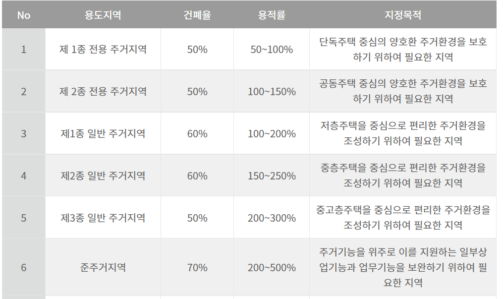 위의 표를 용도지역을 나타낸 표이오니 참고히시면 좋을 것 같습니다.