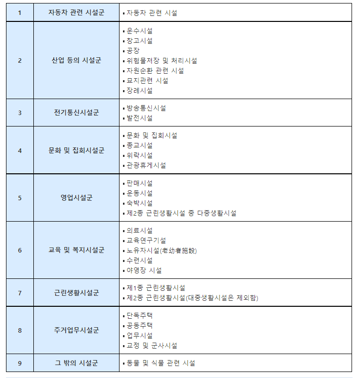아래는 건축물대장 등본,초본에서 확인할수 있는 건축물의 용도를 1~9번까지 나타낸 자료입니다.