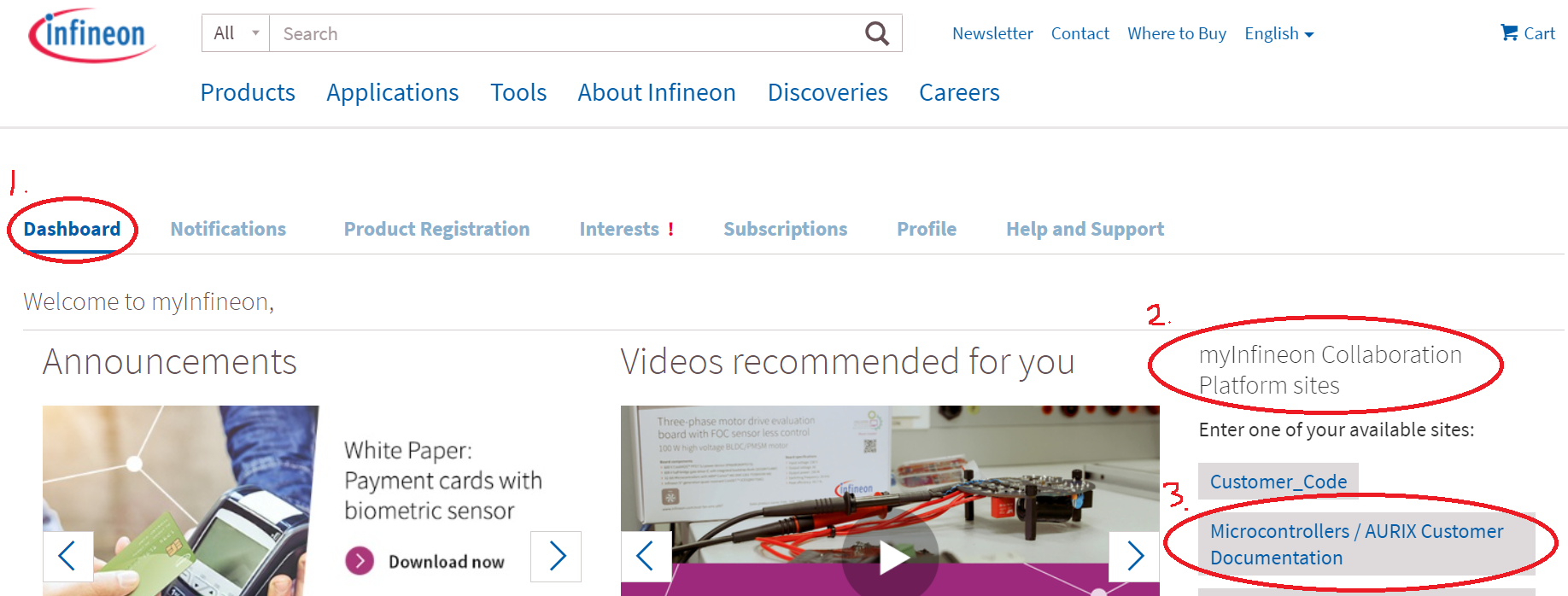 2. Infineon 홈페이지에 들어가서 Dashboard를 누룹니다.