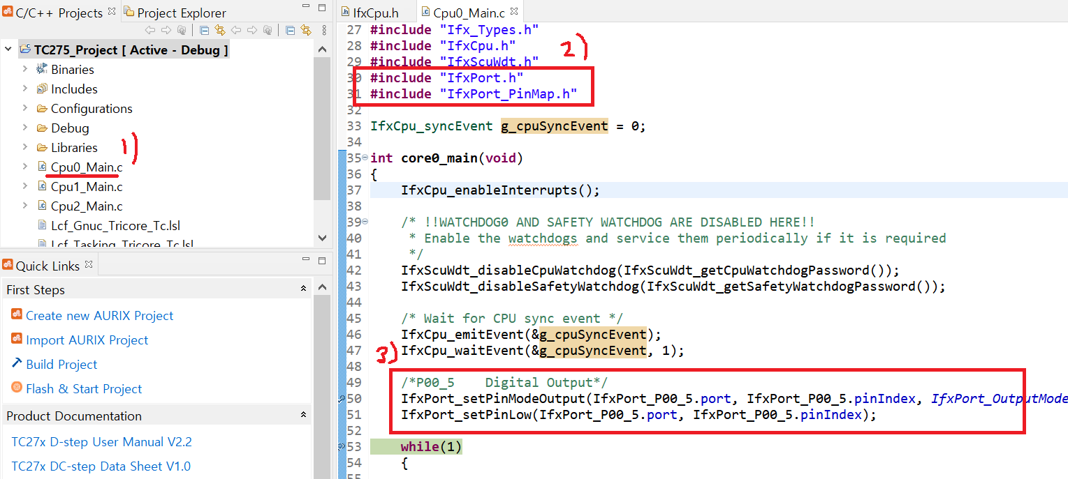 2) IfxPort.h 와 IfxPort_PinMap.h 파일을 include 시켜 주세요.