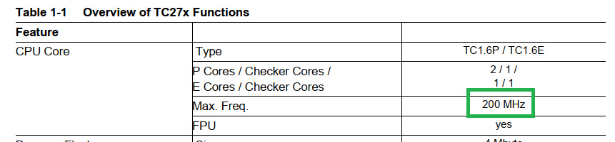TC275의 CPU는 최대 200MHz의 Clock 주파수 까지 사용가능합니다.