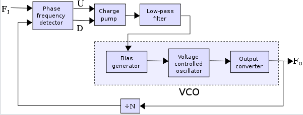 | https://ko.wikipedia.org/wiki/%EC%9C%84%EC%83%81%EB%8F%99%EA%B8%B0%ED%9A%8C%EB%A1%9C 위상동기회로(영어: Phase-Locked Loop, PLL)은 입력 신호와 출력신호에서 되먹임된 신호와의 위상차를 이용해 출력신호를 제어하는 시스템을 말한다. 입력된 신호에 맞추어 출력 신호의 주파수 조절이 목적이다. 되먹임 루프 인 현재 출력 신호의 주파수 디바이더 결과와 입력된 신호와의 위상차를 검출하고, 검출된 위상차를 오차로 판단하여 오차가 줄도록 VCO의 입력전압을 조절함으로써 출력 주파수를 변경하도록 조절한다. 입력과 출력의 되먹임 위상차가 동기되면 위상 잠금이 되고, 잠금 상태가 유지되도록 입력에 대한 출력의 주파수를 조절한다. 입력과 출력의 주파수 차이는 결국 주파수 디바이더 N에 따라 달라진다. N의 배수에 따라, 출력신호의 주파수는 입력신호의 주파수의 N배가 된다. 대부분의 PLL에서 입력에 비해 출력의 주파수가 높게 발진한다. |
