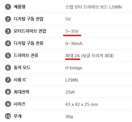 마지막으로 모터드라이브 전압도 5~35V로 DC모터(3~6V) 전압을 제어하는데도 전혀 문제가 되지 않을만큼