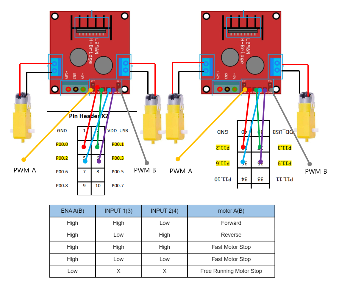모터드라이버의 회적 방향 및 Stop을 위의 진리표와 같이 동작을 하게 됩니다.