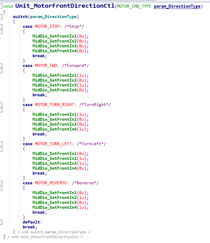 아래 함수는 앞바퀴 2개에 대해서 전진, 좌회전, 우회전, 후진, 정지를 요청하는 함수입니다.